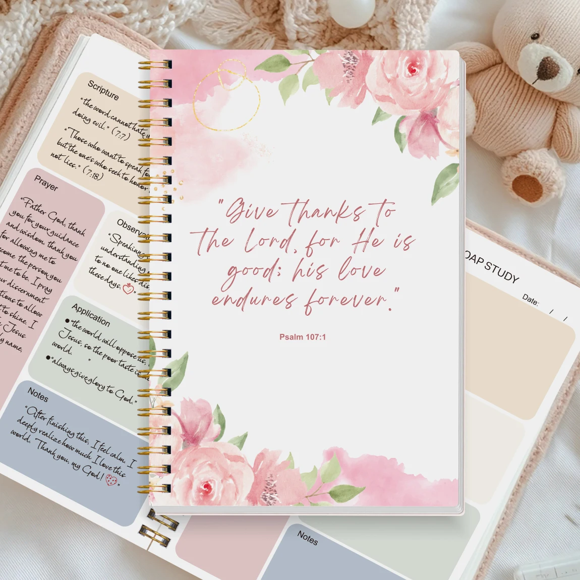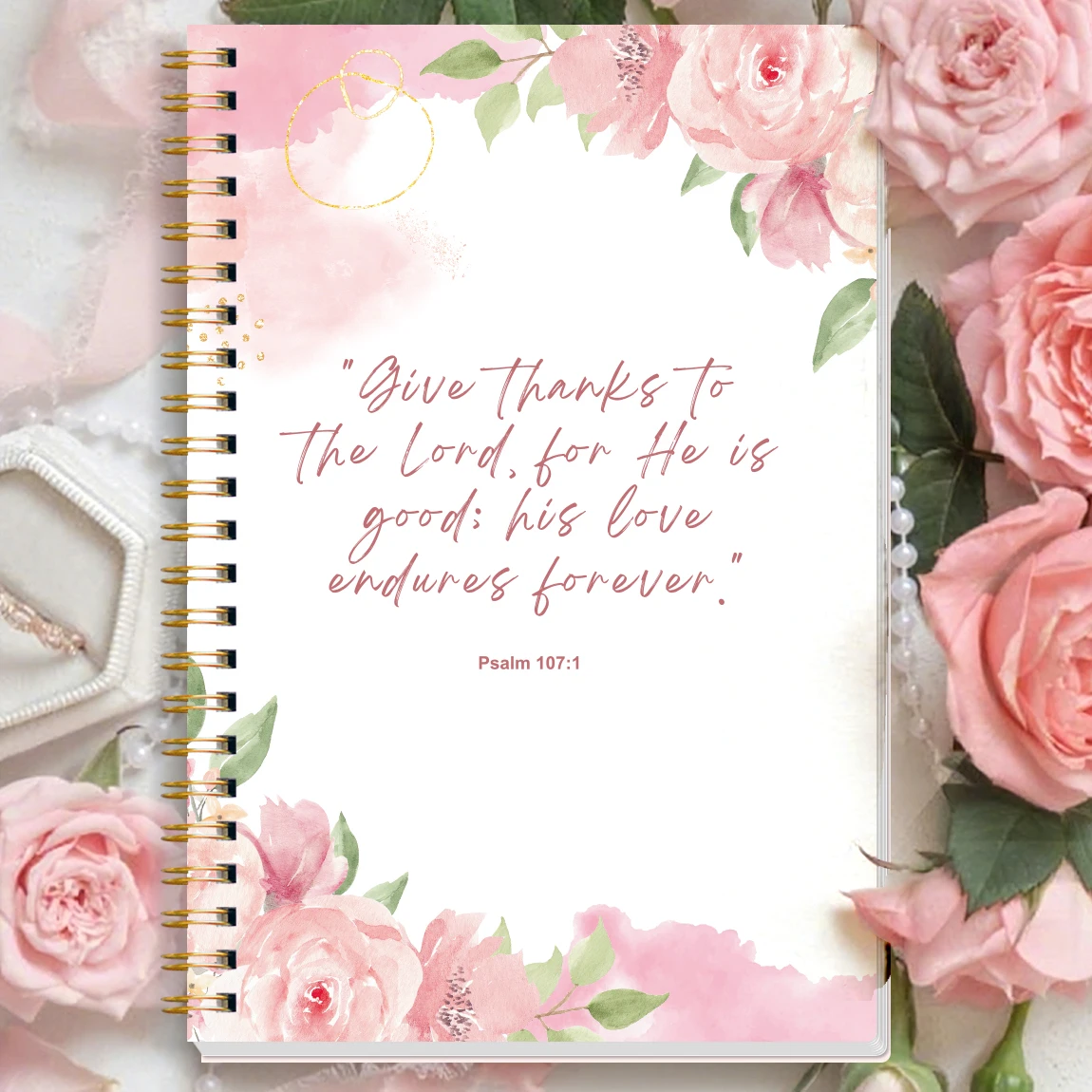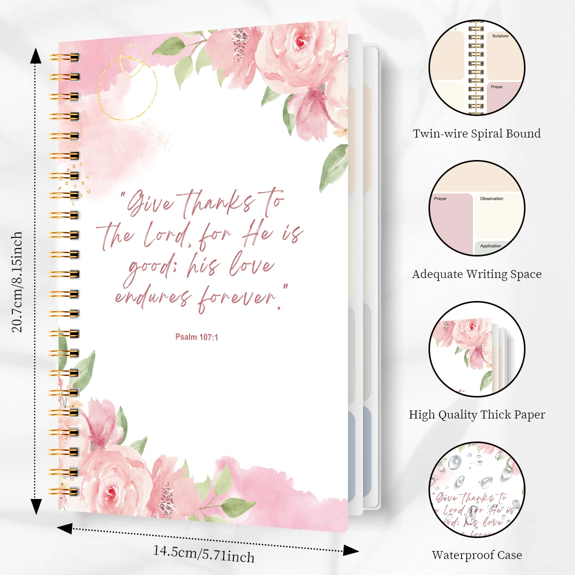 🔸 Inspiring Scripture Cover: The front cover is printed with Psalm 107:1 – “Give thanks to the Lord, for He is good; His love endures forever.” – a daily reminder of God’s grace.